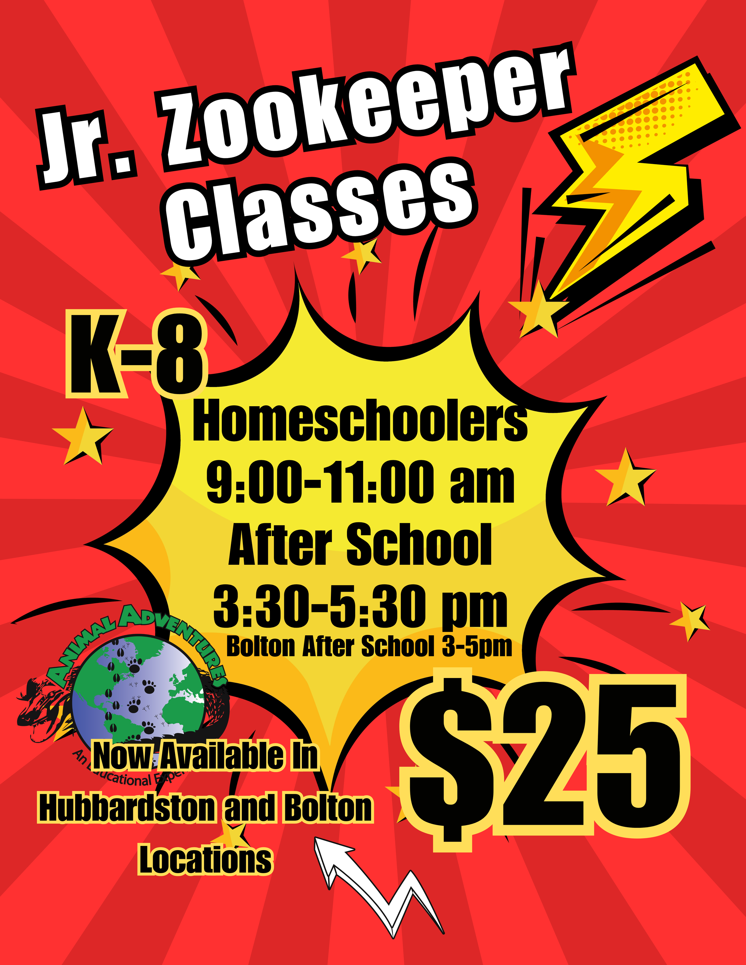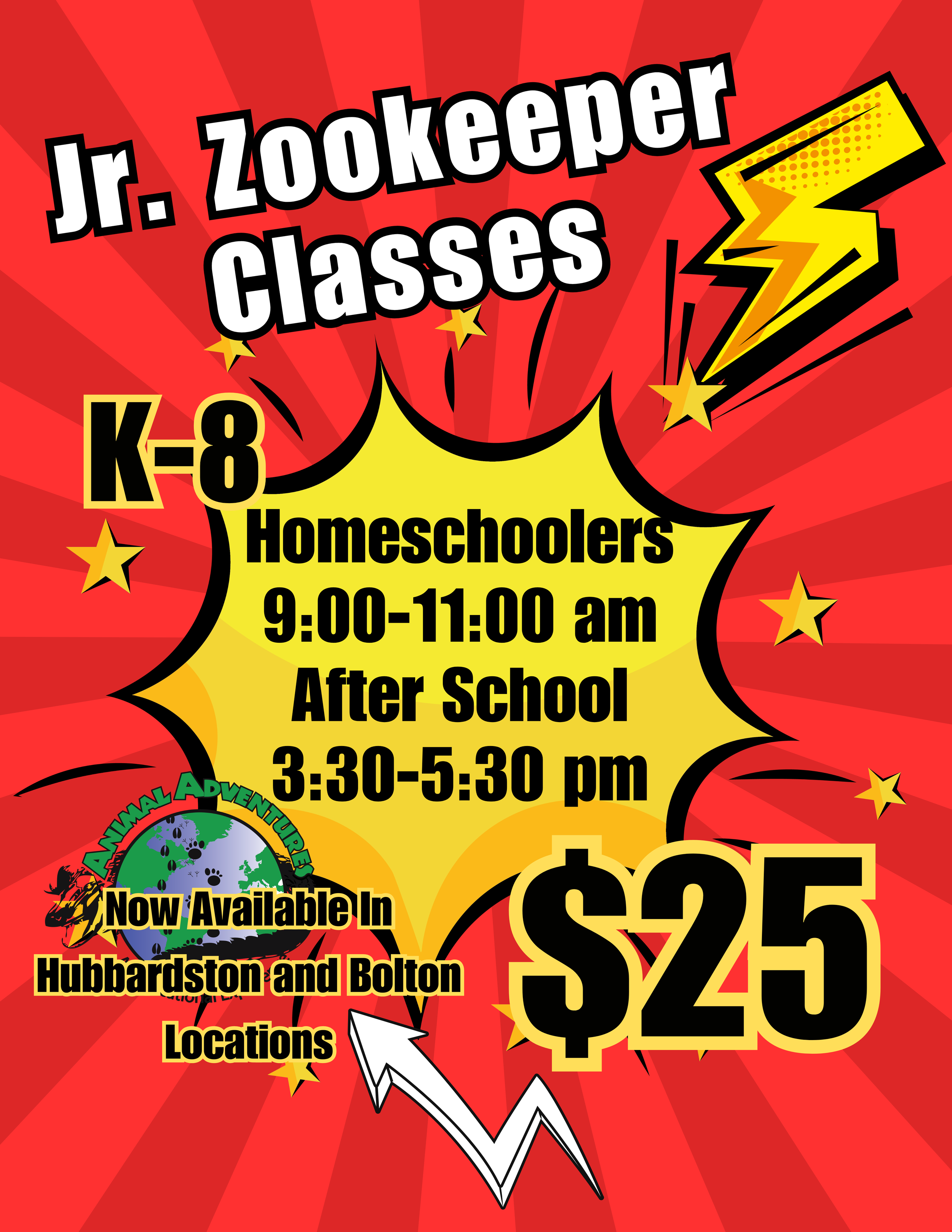 Join our class every Wednesday morning or afternoon and learn the tricks of the trade. Your student will be immersed in the animal kingdom by doing what zookeepers do everyday. From cleaning and feeding to enrichment and husbandry, your child will learn about animals and hard work.