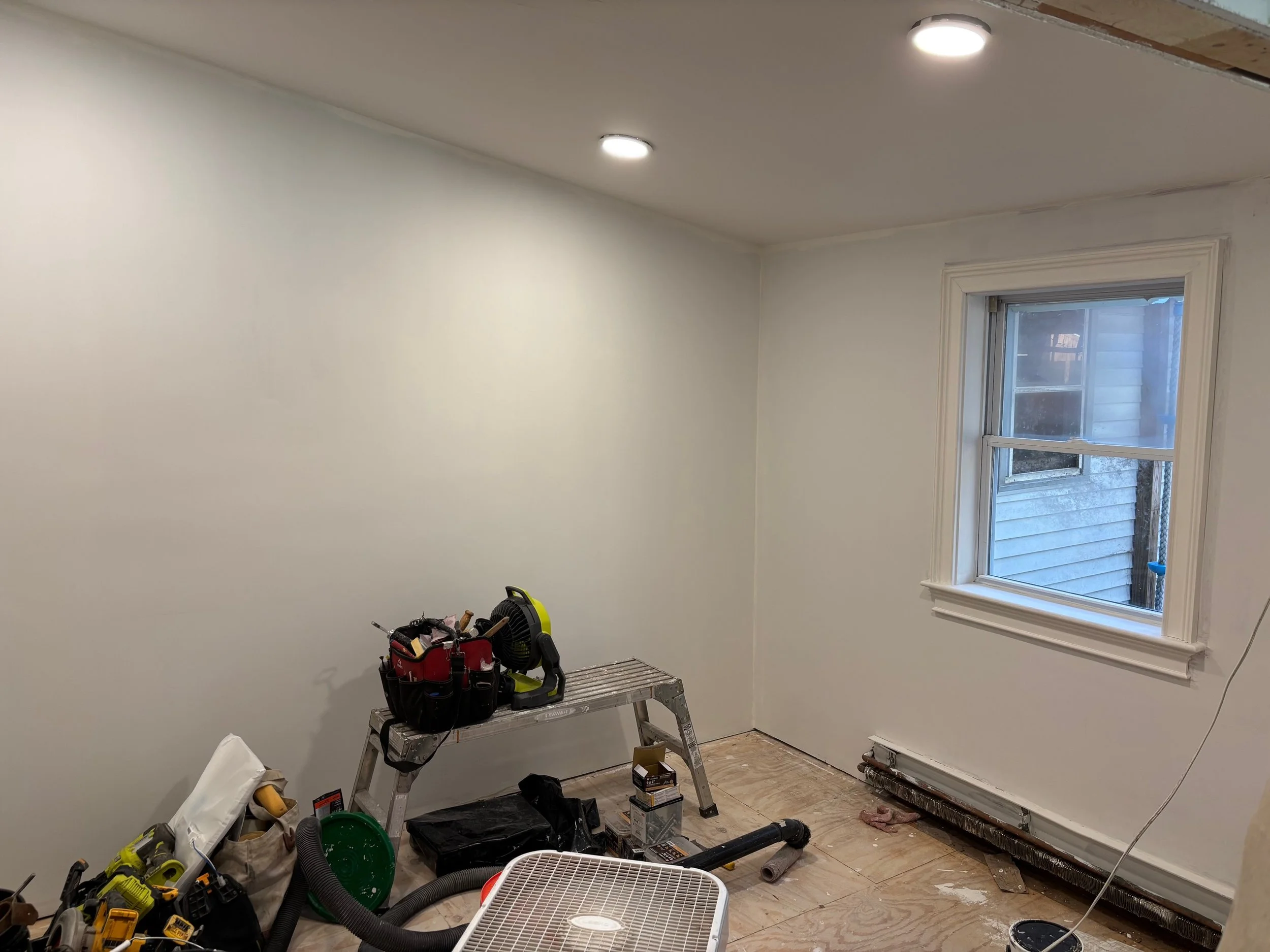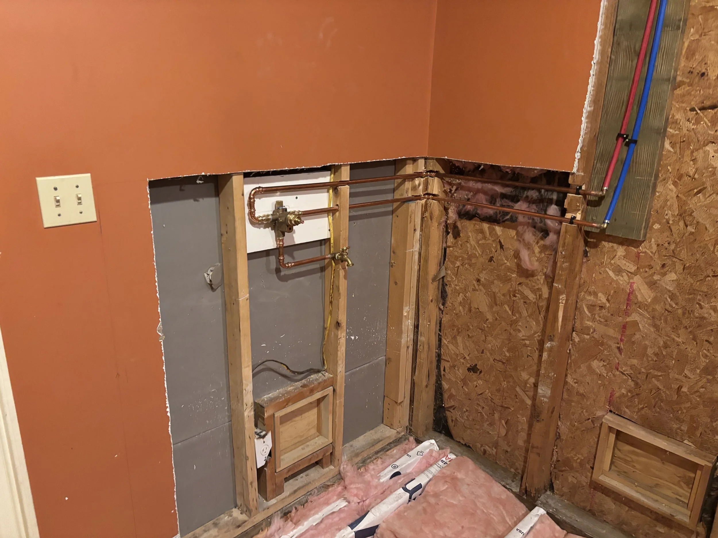 We gutted the old storage room/old master bath, removed the jetted tub, shower stall vanity. Gutted the walls and floor. Jacked the floor up to be level(it was starting to sink). Installed new joists, supports, and plumbing and frame work going in today.